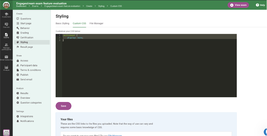 By default, the EasyLMS exam embed displays a logout button. If you want to hide this button for a cleaner user experience, you can add custom CSS in the EasyLMS styling settings.
